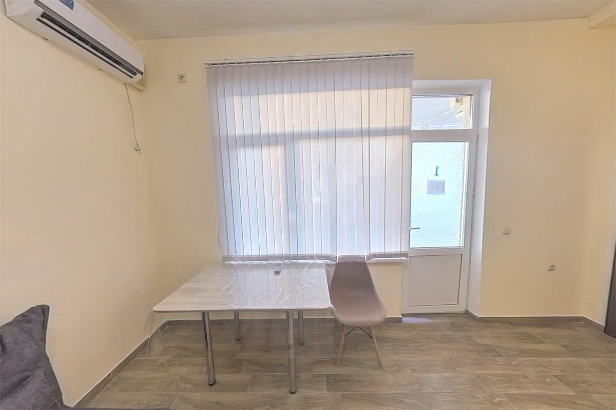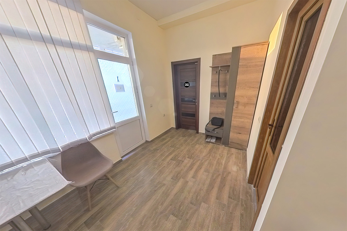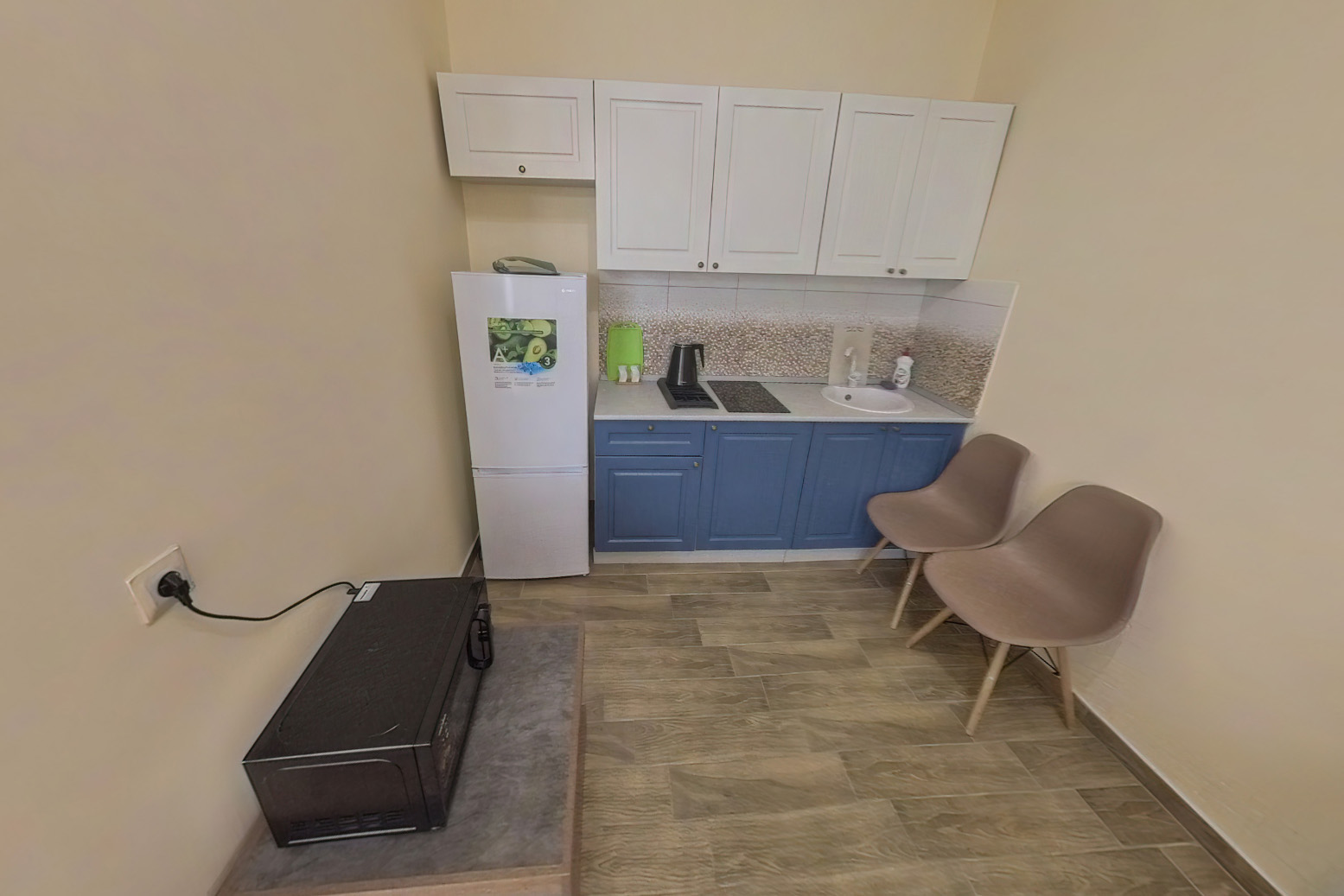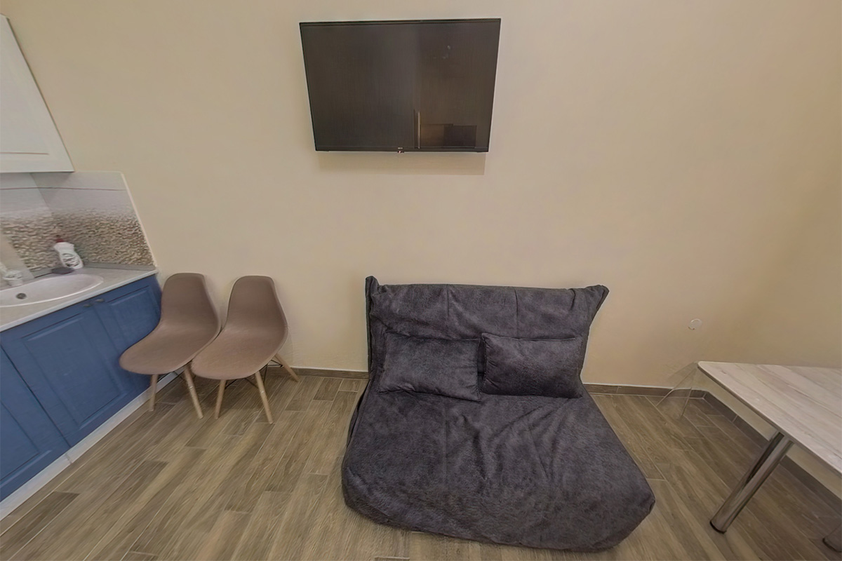 Небольшая кухня-прихожая укомплектована кухонным гарнитуром со шкафами, раковиной, варочной панелью, чайником, микроволновой печью и небольшим холодильником с морозильной камерой. Также в этим помещении находятся небольшой обеденный стол, стулья, кондиционер, раздевалка быстрого доступа со шкафом для верхней одежды и небольшой раскладного диван, на котором можно расположить третье спальное место для ребенка или гостя.